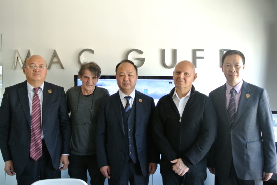 郑立国董事长、校长及学校领导与马克·高夫影视后期制作公司首席执行官菲利普·色瑞尔和执行制片人约翰·佳卡斯合影